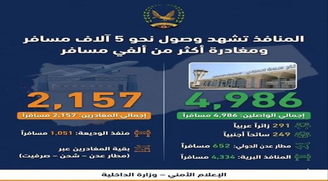سجلت المنافذ البرية والجوية لبلادنا وصول 4986 مسافراً، بينهم 291 زائراً عربياً و249 سائحاً أجنبياً، في إطار حركة التنقل المستمرة عبر المنافذ الرسمية. ...