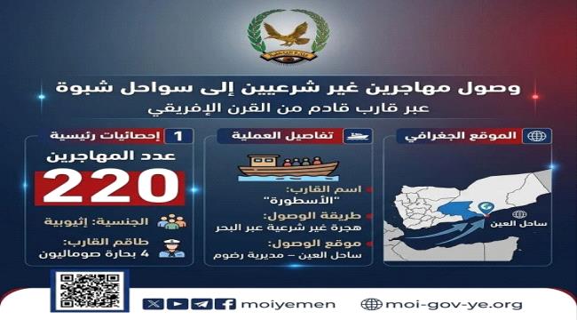 تلقت شرطة محافظة شبوة بلاغاً بوصول قارب إلى ساحل العين بمديرية رضوم، وعلى 220 المهاجرين غير الشرعيين قادمين من القرن الأفريقي. وأوضحت الشرطة ، بحسب ال...