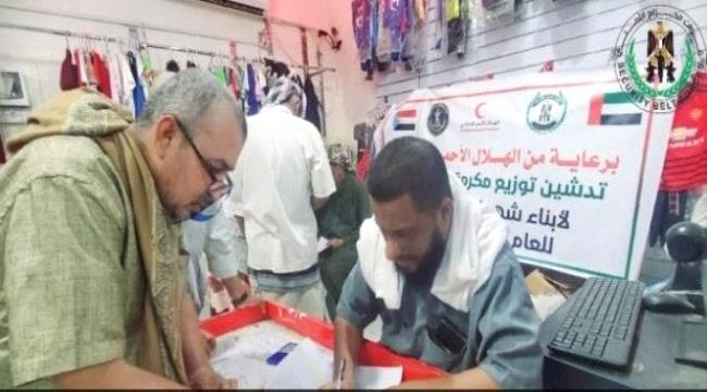 دشنت هيئة الهلال الأحمر الإماراتي اليوم توزيع مكرمة كسوة العيد لأبناء شهداء الحزام الامني بمحافظة أبين،حيث استهدفت 316 اسرة شهيد .