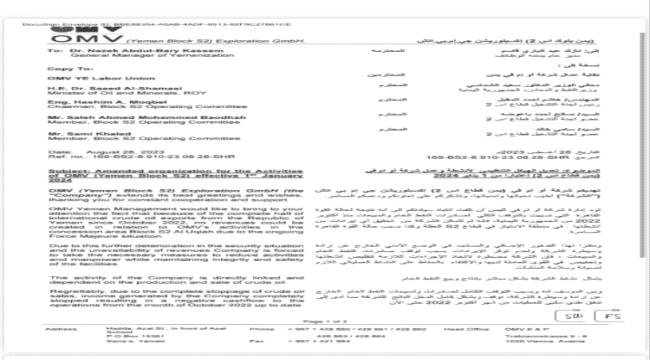 قررت شركة "أو إم في" النمساوية العاملة في حقل العقلة النفطي بمحافظة شبوة الاستغناء عن مائتي موظف، إعتبارًا من بداية العام القادم، على خلفية توقف تصدير النفط، منذ أكتوبر الماضي، جراء هجمات مليشيا الحوثي على موانئ التصدير.