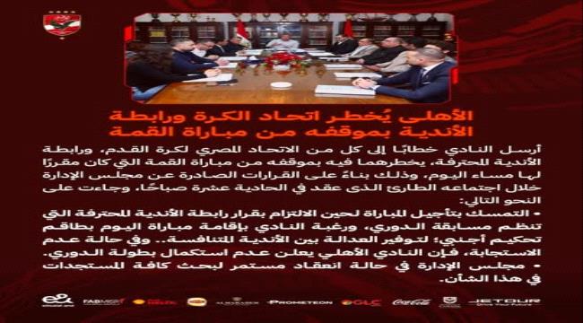 وقال بيان الأهلي: "ناقش مجلس إدارة النادي في اجتماعه الطارئ الذي جرى في الساعة الحادية عشرة صباحا، التخبط الواضح الذي تشهده المنظومة الكروية بشكل غير مسبوق، فضلا عن عدم التنسيق بين الاتحاد المصري لكرة القدم ورابطة الأندية المحترفة الذي يدفع الأندية إلى أزمات ومشاكل مستمرة".