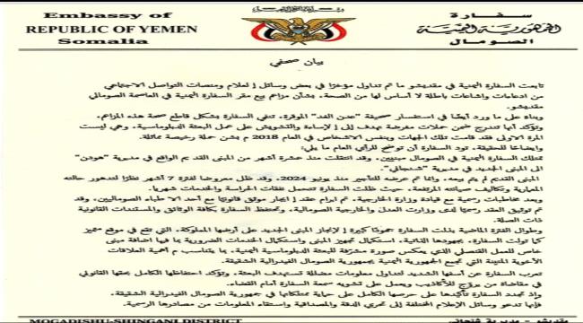 وأكدت السفارة، في بيان رسمي، أن هذه الشائعات لا أساس لها من الصحة وتندرج ضمن حملات ممنهجة ومغرضة تهدف إلى التشويش والإساءة لعمل البعثة الدبلوماسية اليمنية في الصومال. كما أوضحت أن هذه ليست المرة الأولى التي يتم فيها استهداف السفارة بهذه الطريقة، حيث سبق أن تم تداول ادعاءات مماثلة في العام 2018 من نفس الجهات والأشخاص.