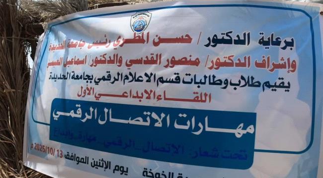 أقام طلاب وطالبات قسم الإعلام الرقمي بجامعة الحديدة، اليوم في الخوخة، اللقاء الإبداعي الأول في مهارات الاتصال تحت شعار "الاتصال الرقمي.. مهارة وإبداع"، برعاية رئيس الجامعة الأستاذ الدكتور حسن المطري، وإشراف رئيس القسم الدكتور منصور القدسي، ومتابعة الدكتور إسماعيل العبسي.