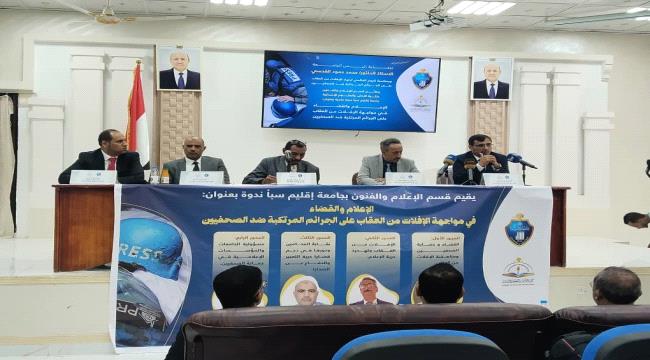 أقيمت، اليوم، في مدينة مأرب ندوة بعنوان "الإعلام والقضاء في مواجهة الإفلات من العقاب على الجرائم المرتكبة ضد الصحفيين"، نظمها قسم الإعلام والفنون بجامعة إقليم سبأ، بمناسبة اليوم الدولي لإنهاء الإفلات من العقاب.