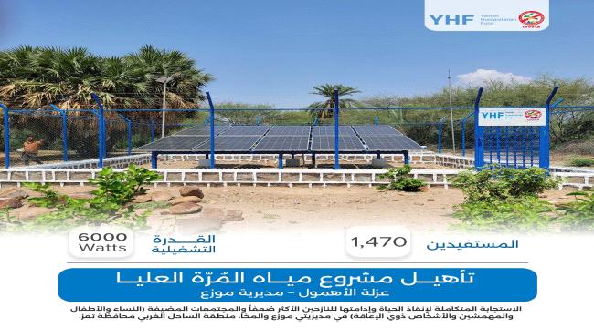 نفذت منظمة أجيال بلا قات (GWQ)، وبدعم من صندوق التمويل الإنساني – اليمن(YHF)،مشروع تأهيل مصدر مياه المُرّة العليا في عزلة الأهمول بمديرية موزع في محافظة تعز، بهدف توفير مياه آمنة ومستدامة لـ 1,470 مستفيدا من سكان المنطقة والقرىالمجاورة.