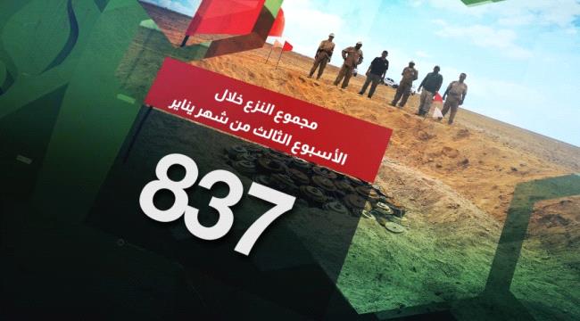 وأشار مكتب �مسام� الإعلامي، نقلاً عن غرفة العمليات، إلى أن فرق المشروع تمكنت خلال الأسبوع الماضي وحده من نزع 837 لغماً وذخيرة غير منفجرة وعبوة ناسفة، فيما نجحت فرق المشروع خلال الأسبوع الثالث من يناير في نزع 729 ذخيرة غير منفجرة، و104 ألغام مضادة للدبابات، و3 عبوات ناسفة، إلى جانب لغم واحد مضاد للدبابات.