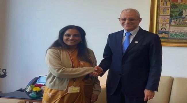 حضر اللقاء، سفير اليمن لدى الهند، عبدالملك الإرياني، وعضو دائرة مكتب وزير الخارجية، الدكتورة لارا العباسي.