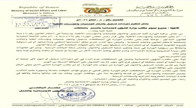 وألزم التعميم رقم (2) لسنة 2026م جميع مديري مكاتب الوزارة في المحافظات بالحصول على موافقة مسبقة من الوزير شخصياً قبل الشروع في أي إجراءات تتعلق بتسجيل أو إشهار الجمعيات والمؤسسات الأهلية وفروعها، وذلك عبر ديوان الوزارة أو المكتب الوزاري المختص، فيما يُعدّ هذا الإجراء تحوّلاً في آلية العمل السابق الذي كان يمنح المكاتب المحلية هامشاً من الاستقلالية في اتخاذ القرارات.