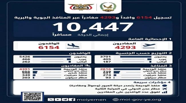 سجلت المنافذ الجوية والبرية في المحافظات المحررة دخول 6154 وافداً ومغادرة 4293 مسافراً، وذلك وفقاً للتقرير الإحصائي الصادر عن الجهات المختصة بوزارة الداخلية بشأن حركة العبور عبر المنافذ.