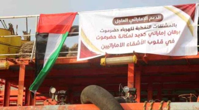 وصلت، مساء الثلاثاء، شحنة مشتقات نفطية إسعافية لكهرباء ساحل حضرموت بدعم من هيئة الهلال الأحمر الإماراتي.