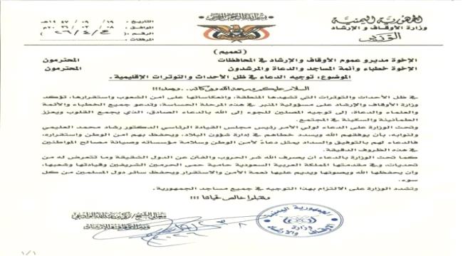 وجّه معالي وزير الأوقاف والإرشاد، الشيخ تركي بن عبدالله الوادعي، اليوم، أئمة وخطباء المساجد والدعاة في الجمهورية، إلى تكثيف الدعاء الصادق لله تعالى في...